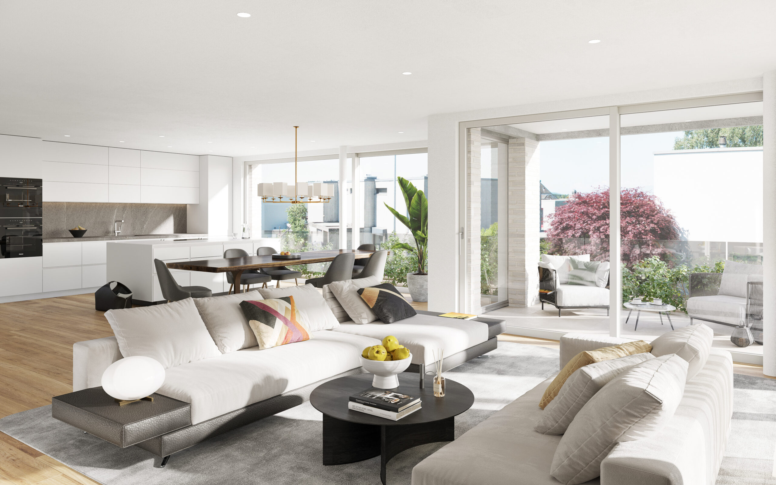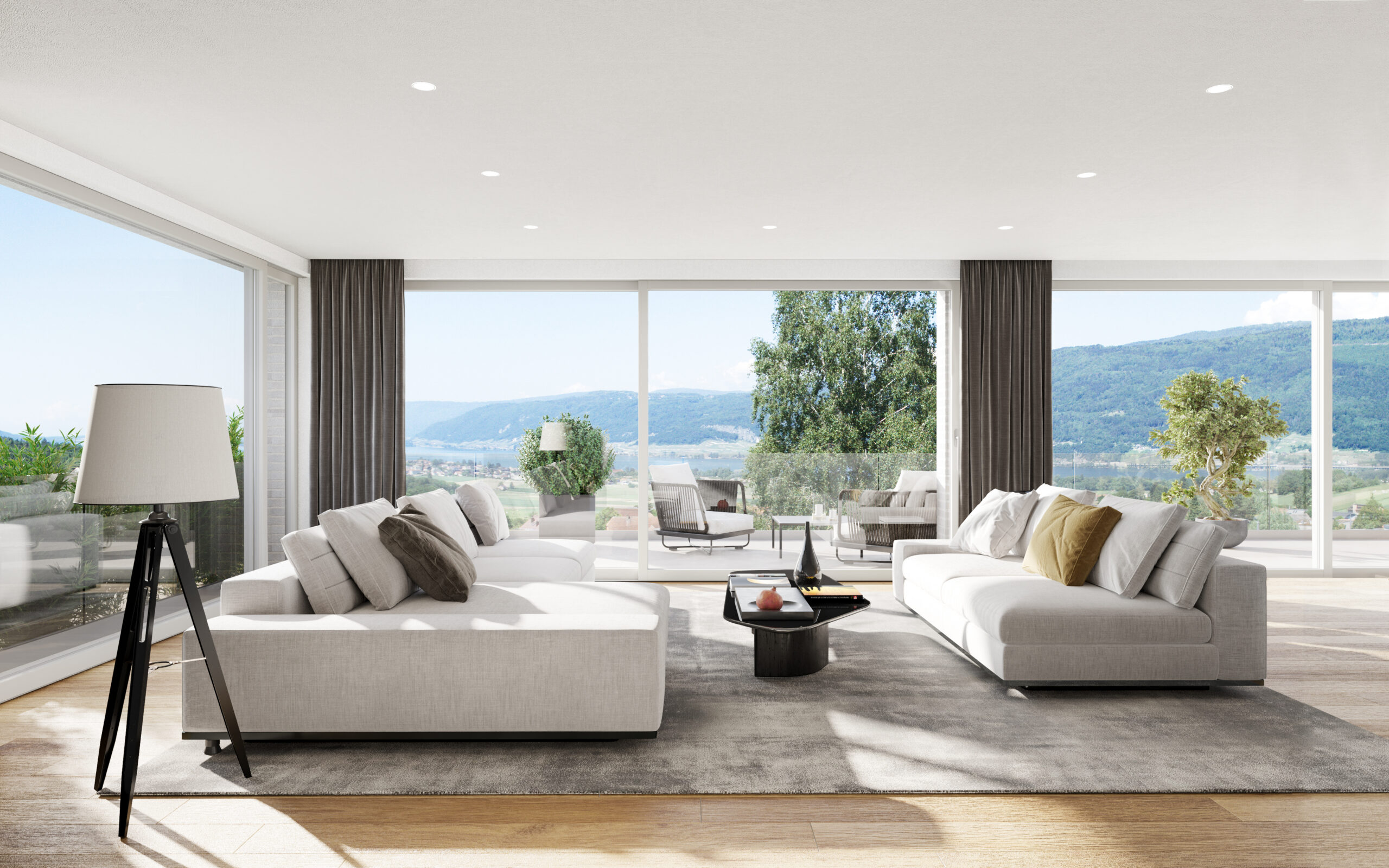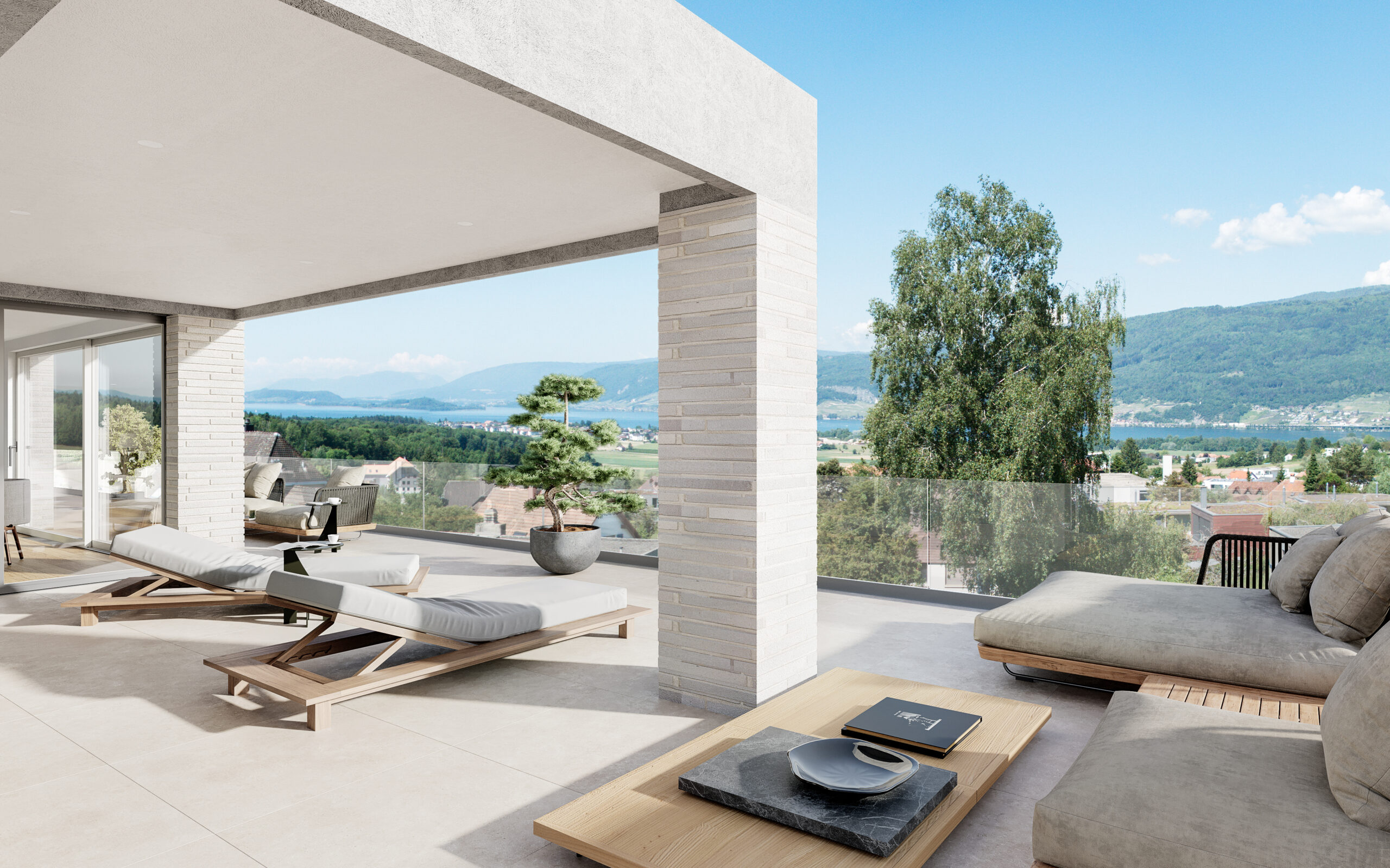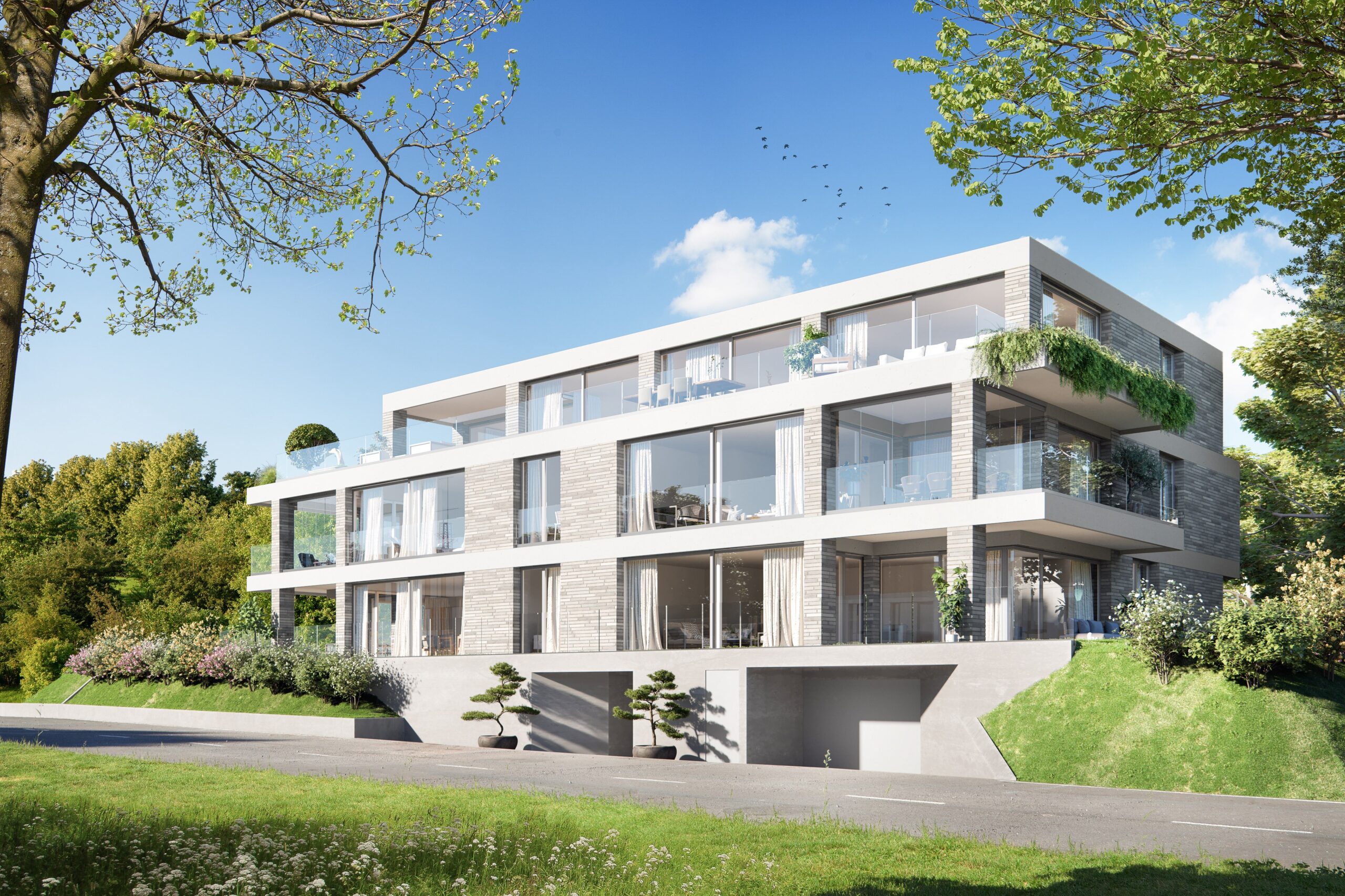 Das Neubauprojekt an sonniger Lage besteht aus vier attraktiven Eigentumswohnungen und einem Attikageschoss mit einer Wohnung inklusive grosser Sonnenterrasse, alle mit wunderbarem Blick auf See und Alpen.